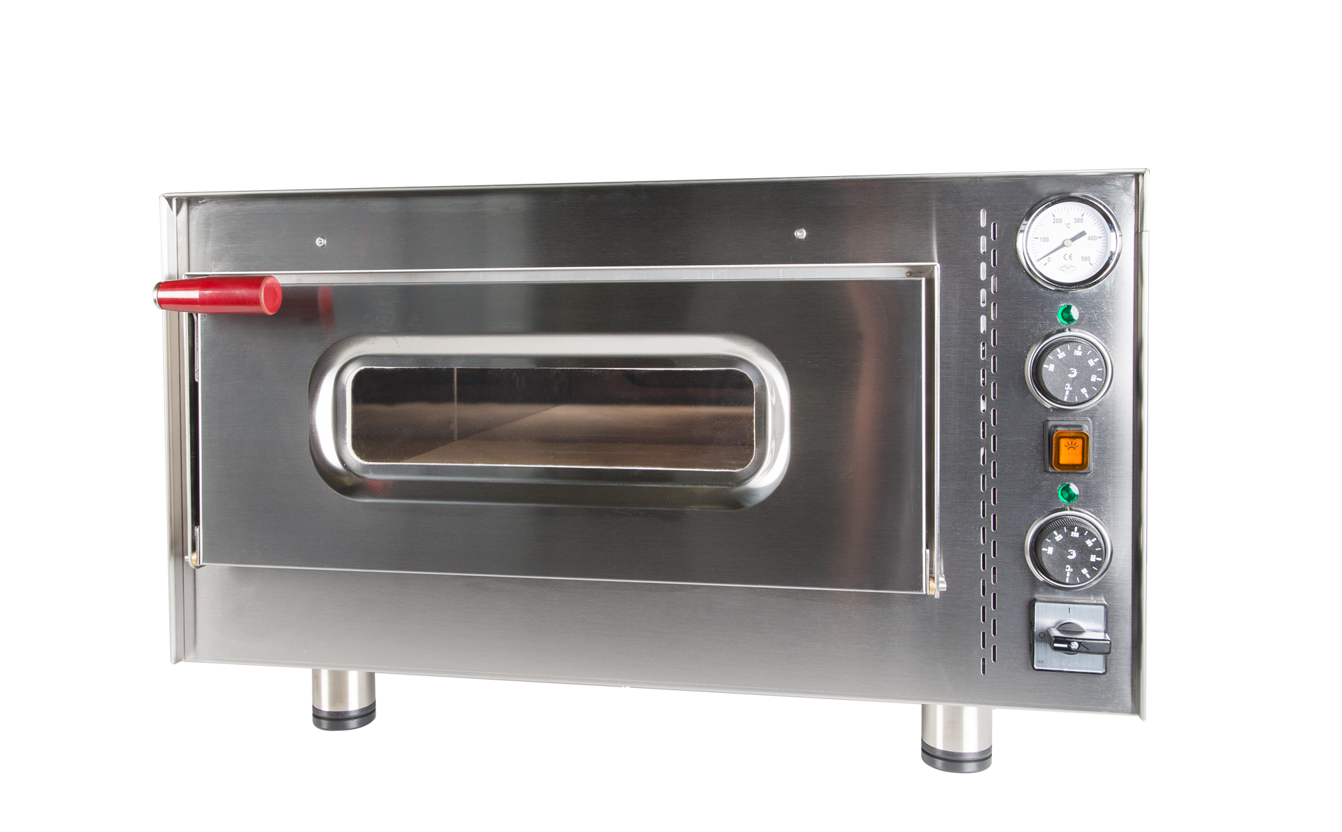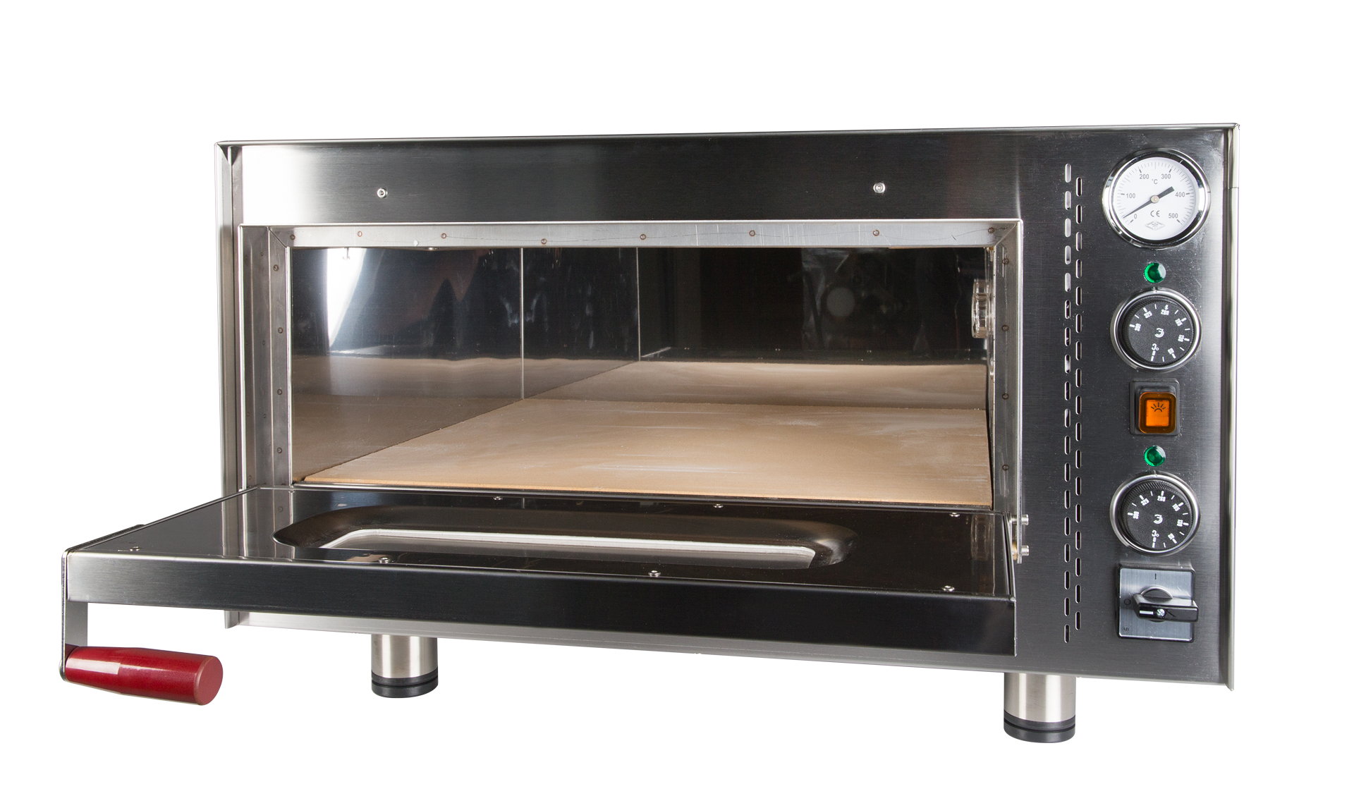 Der Schamotte-Steinbackofen bietet eine Temperaturregelung von 50°-390°C, die dank eines Thermometers einfach abgelesen werden kann. Die Ober- und Unterhitze sind separat regulierbar und die Bedienung ist intuitiv. Die Unterhitze reguliert den Schamotte-Steinboden. Die Tür ist mit einem Sichtfenster ausgestattet und die Innenbeleuchtung ermöglicht eine einfache Kontrolle des Backvorgangs. Der Backofen heizt sich sehr schnell auf und ist leicht zu reinigen. Er ist komplett aus Edelstahl gefertigt und sparsam im Energieverbrauch. Im Lieferumfang sind die Stellfüße enthalten.